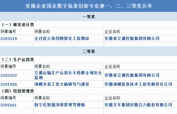 此次比賽中,安徽省屬企業(yè)共有1個(gè)應(yīng)用場(chǎng)景獲得一等獎(jiǎng),3個(gè)應(yīng)用場(chǎng)景獲得二等獎(jiǎng),6個(gè)應(yīng)用場(chǎng)景獲得三等獎(jiǎng)。