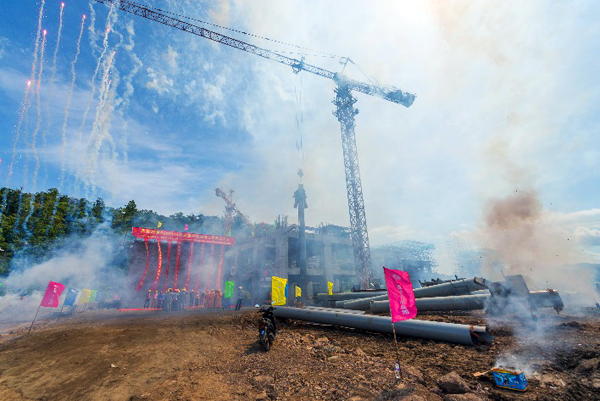 2016年11月26日,印尼北蘇海螺項目現(xiàn)場,海闊天高、晴空萬里、彩旗飄揚、安裝塔吊高聳入云,伴隨著喜慶的鞭炮聲,窯尾框架第一根立柱吊裝順利完成,標志著北蘇海螺5000t/d水泥熟料生產(chǎn)線安裝工程正式啟動,項目進入設(shè)備安裝階段。