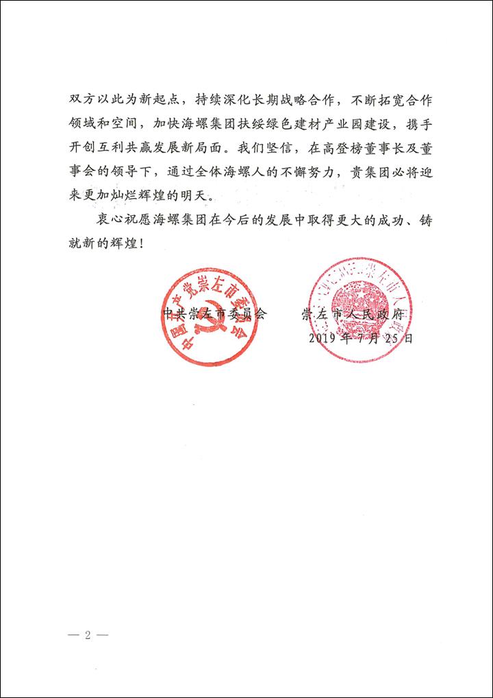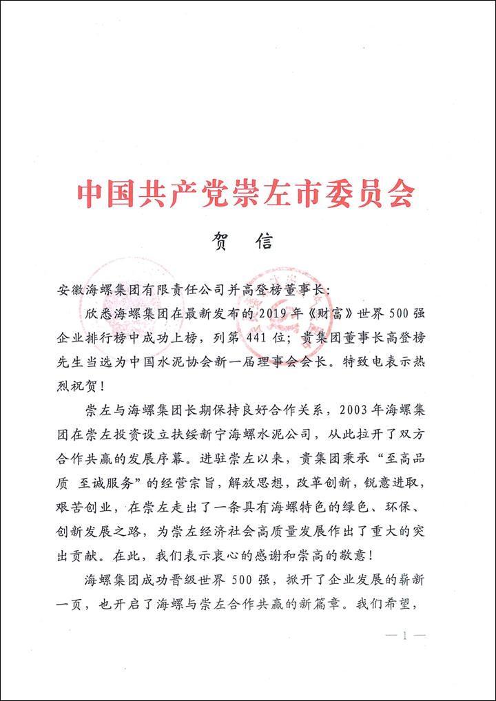 中國(guó)共產(chǎn)黨崇左市委員會(huì)致海螺集團(tuán)賀信