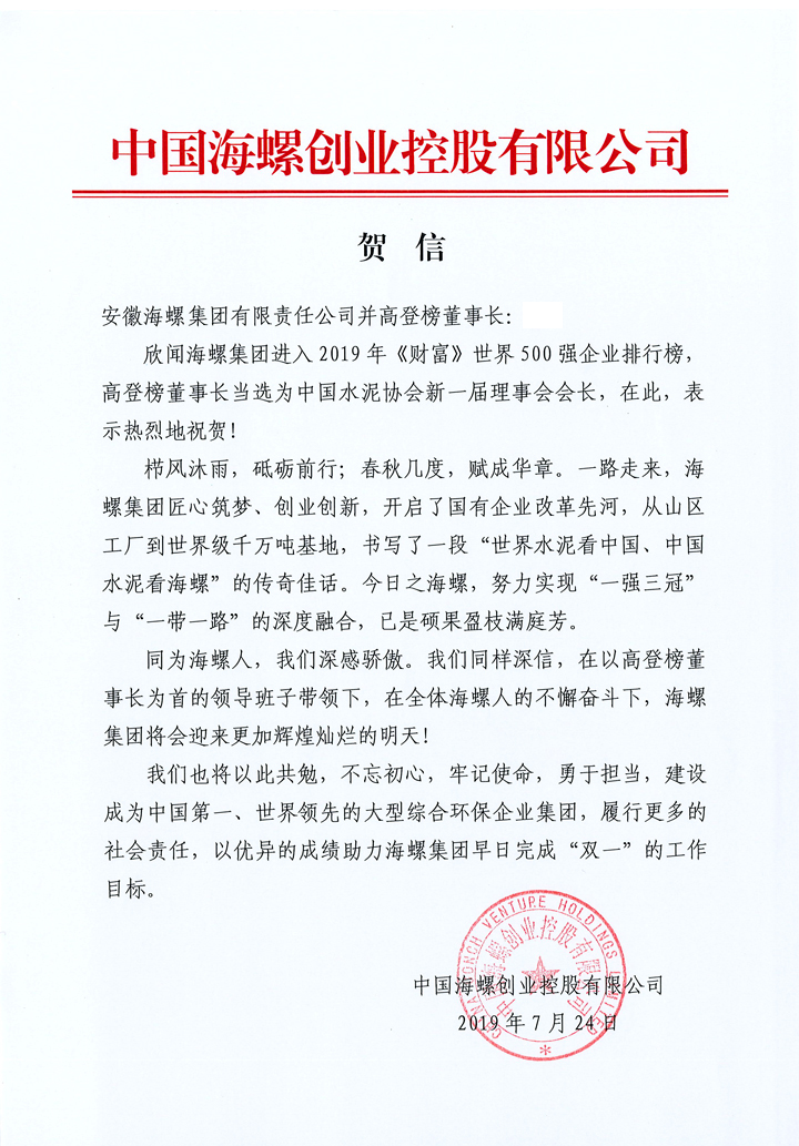 海螺創(chuàng)業(yè)致海螺集團并高登榜董事長賀信