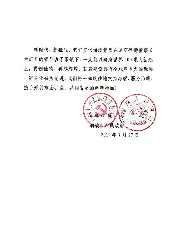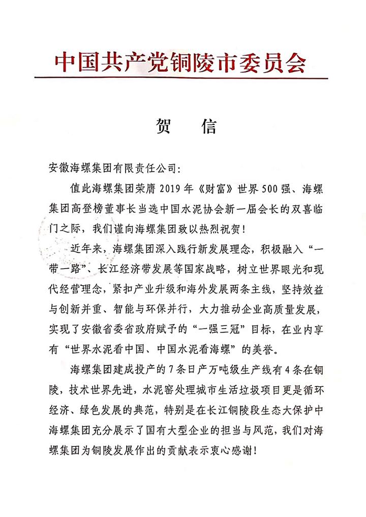 銅陵市委、市政府致海螺集團(tuán)賀信
